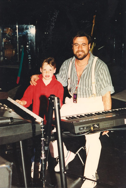Roman (my son) was impressed with my keyboard set up. He is now my best friend and closest ally. On the left, Roman has his hand on a Kurzweil K250 digital piano. There’s a Yamaha DX7 above that and there’s a Roland Jupiter-8 on the right. George Benson’s keyboard player showed me how to program a bunch of really cool sounds into the DX7.